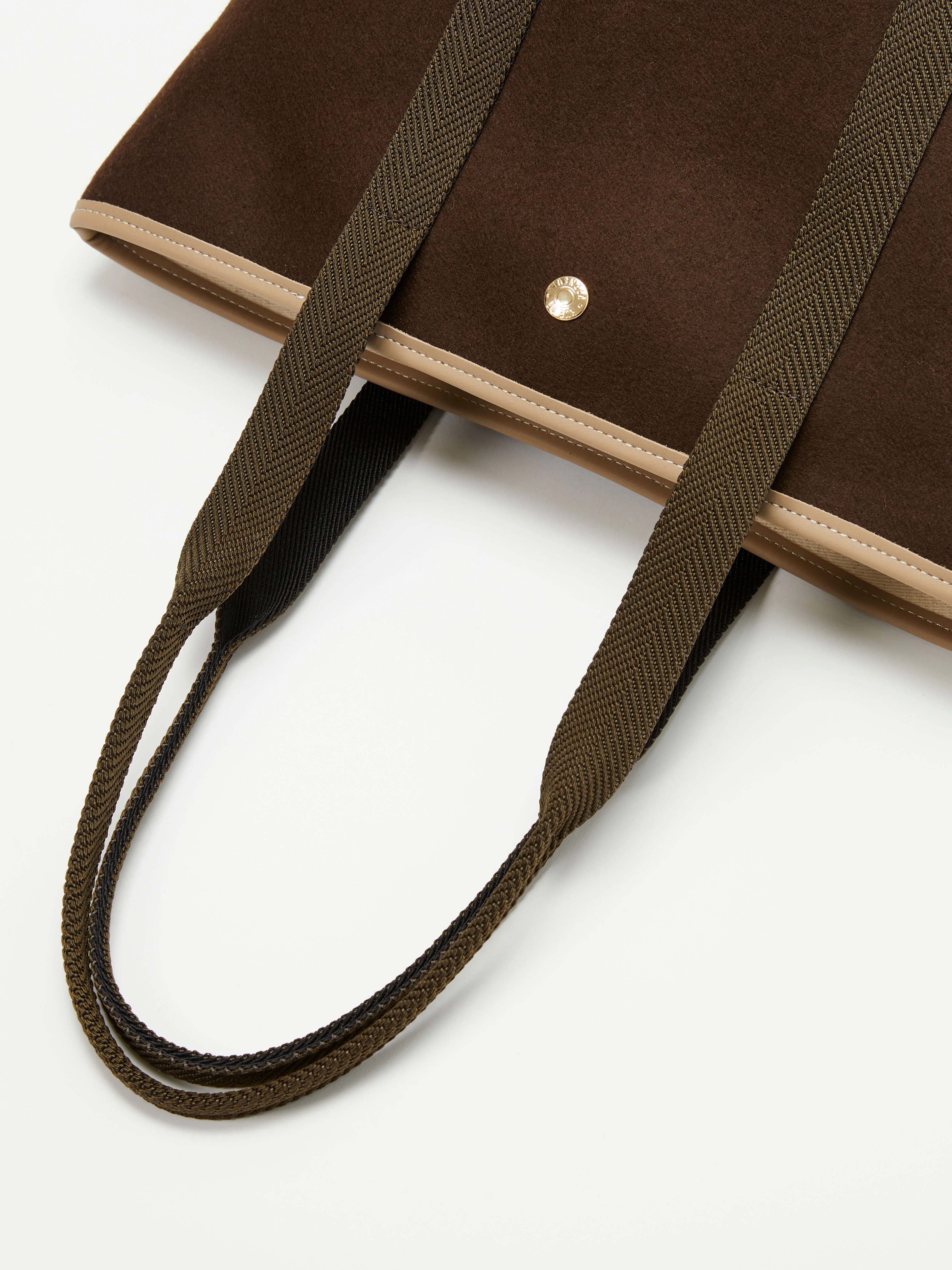 Crafted from soft dark brown flannel, this tote takes its name from the equestrian world. Featuring an exterior front pocket. The brown handles are accented with beige leather trim, creating a subtle yet sophisticated contrast.