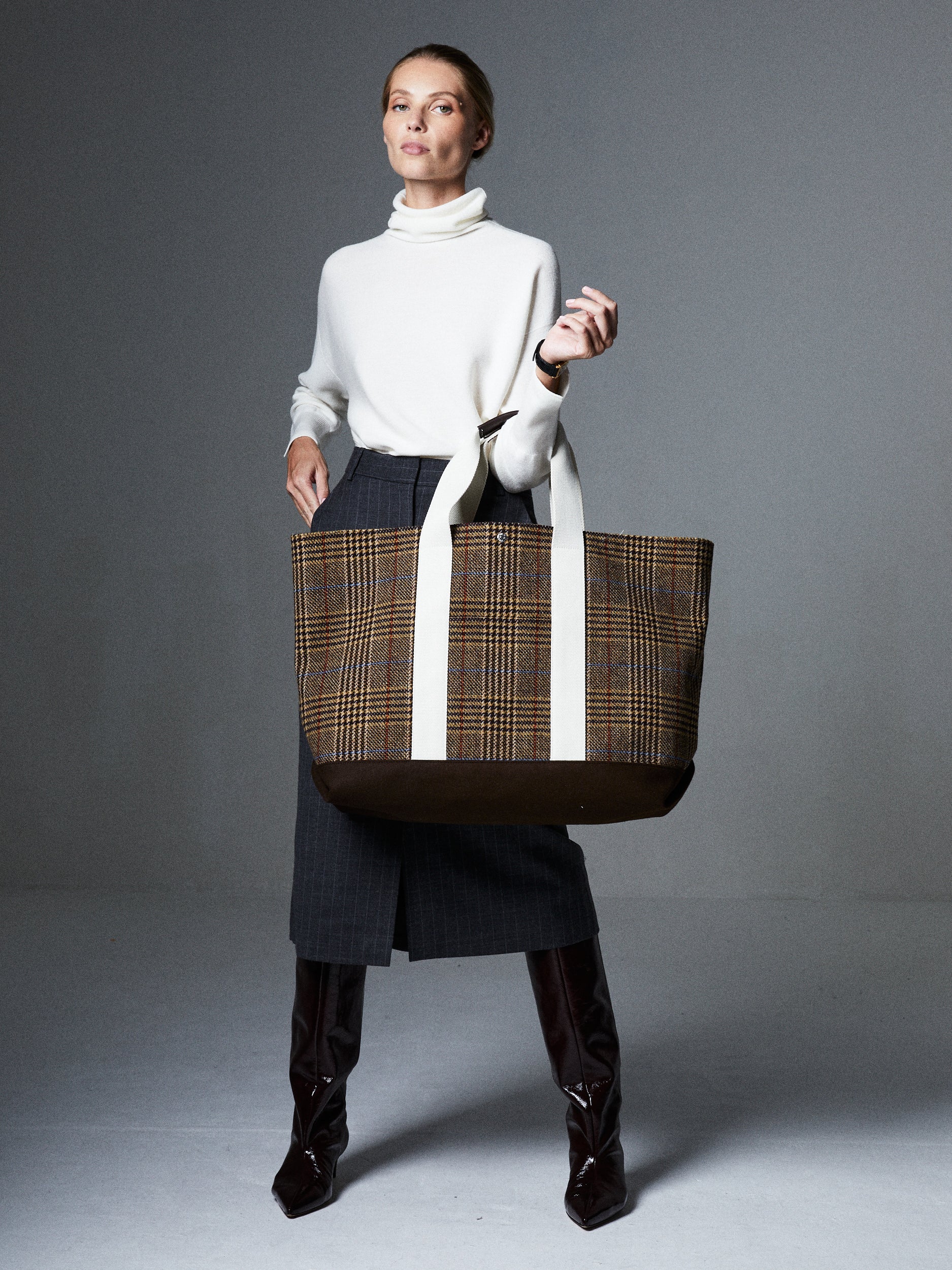 Our extra large Club PDG bag, crafted from a checkered wool, features a sturdy dark brown cotton bottom part. It is ideal if you need a lot of carrying capacity, whether it is a weekend trip, or an errand run. The soft and neutral colours make it an easy addition to many looks.