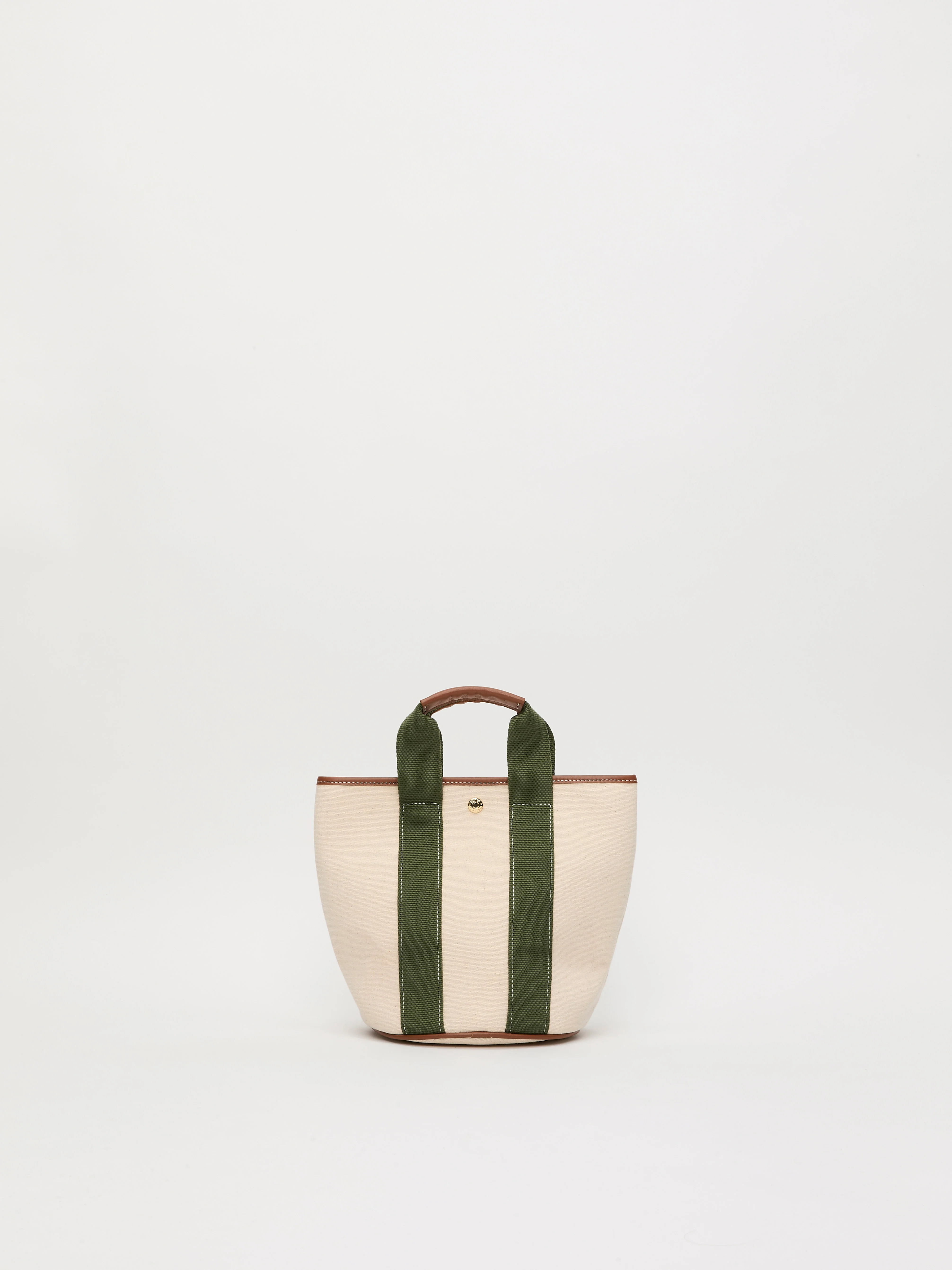 The Cruise Bucket , crafted from white cotton, features a kaki strap and camel leather. This bag is designed to carry your essentials wherever you go.