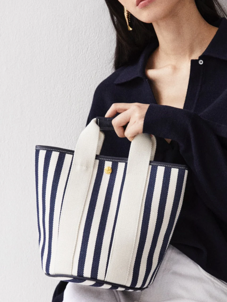 The Cruise Bucket bag, crafted from cotton, features navy and white vertical stripes, a white rope strap and navy leather finishes.