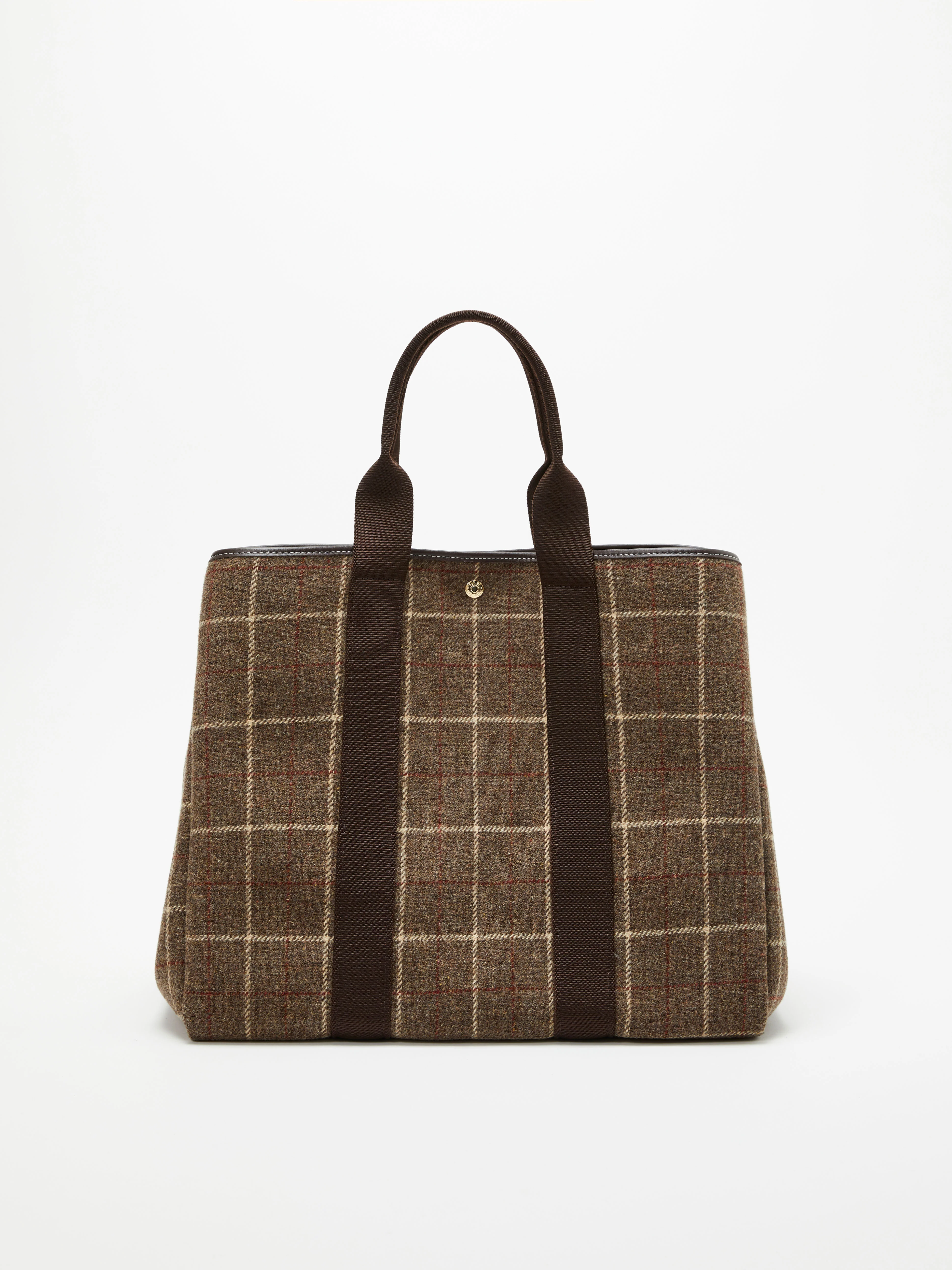 Our large Traversée Hunting Tweed bag, inspired by the historical British Hunting Tweed, is crafted from patterned brown wool, featuring contrasting dark brown handles.